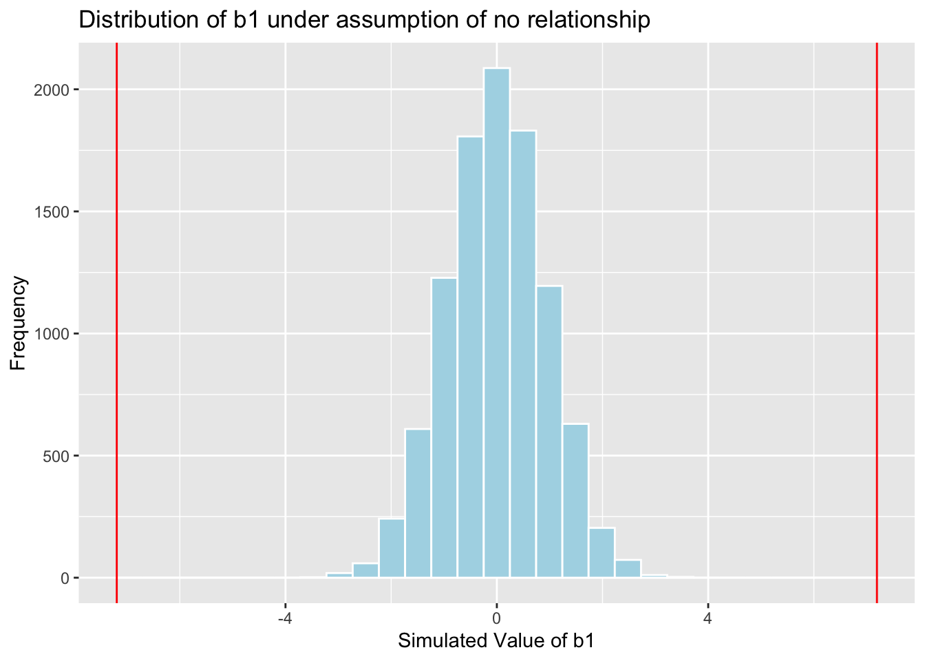 Observe how many of our simulations resulted in values of \(b_1\) as extreme as the one from the actual data. If this proportion is small, we have evidence that our result did not occur just by chance. If this value is large, it is plausible that the result we saw occurred by chance alone, and thus there is not enough evidence to say there is a relationship between the explanatory and response variables.