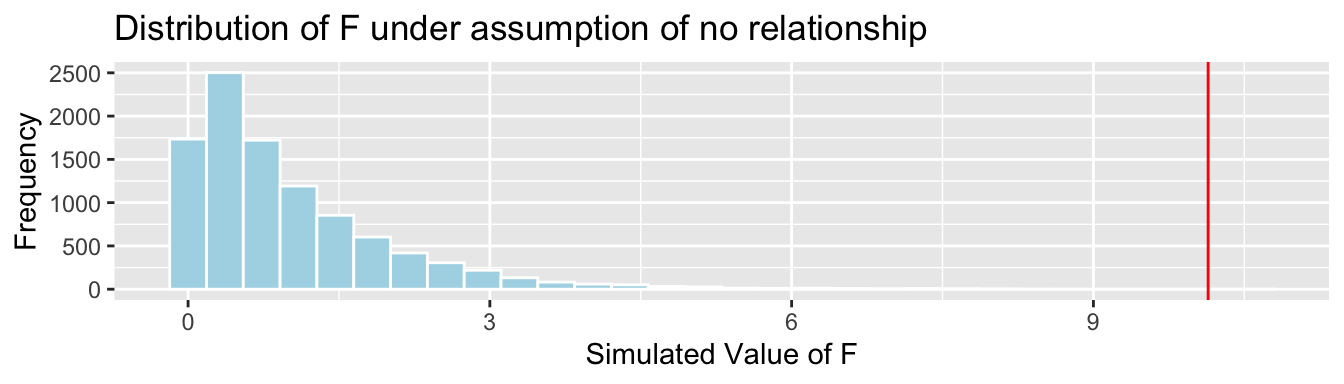 When testing for a relationship between the response variable and a categorical variable with more than 2 categories, we first use the F-statistic to capture the maginitude of differences between groups. The process is similar to the one above, with the exception that we recored the value of F, rather than \(b_1\).