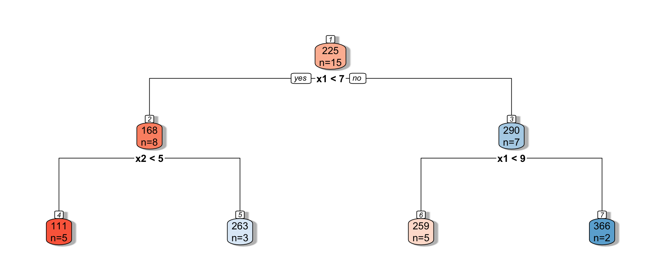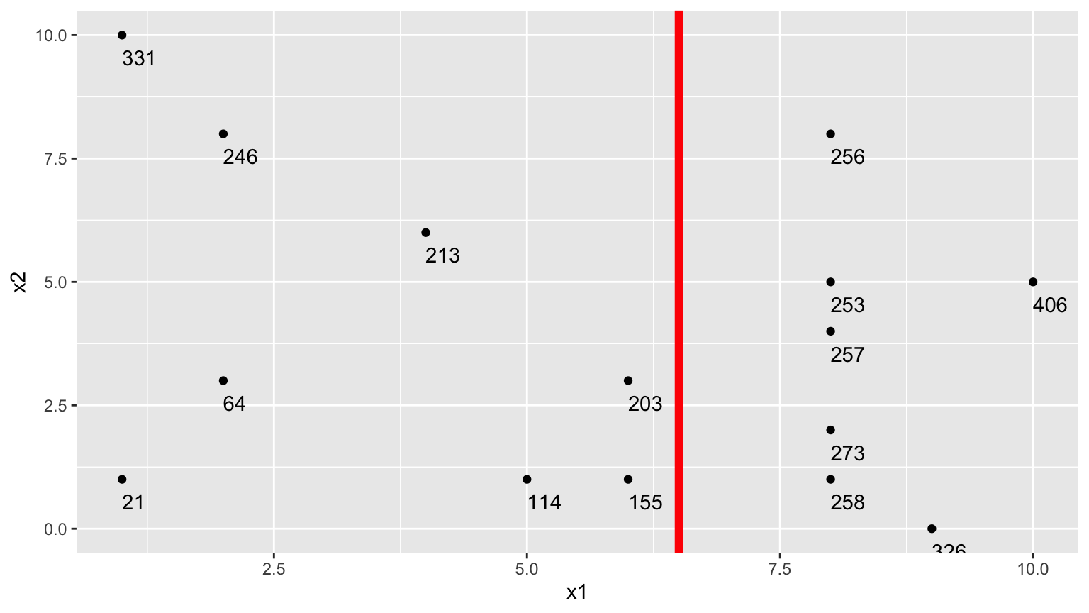 In fact, if we calculate all possible splits over \(x_1\) and \(x_2\), \(\displaystyle\sum_{i=1}^{n_L} (y_i -\bar{y}_L)^2 + \displaystyle\sum_{i=1}^{n_R} (y_i -\bar{y}_R)^2\) is minimized by splitting on \(x_1 < 6.5\)