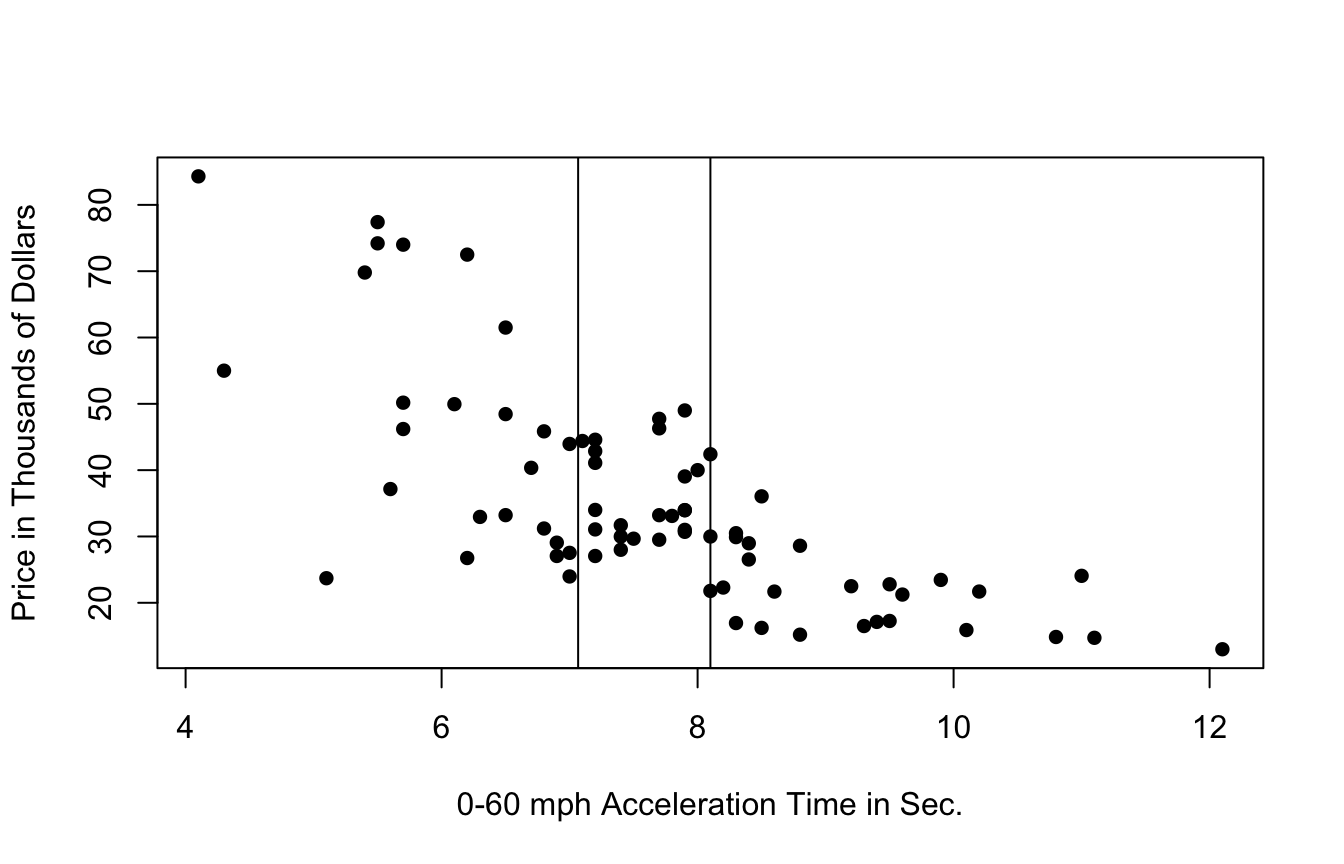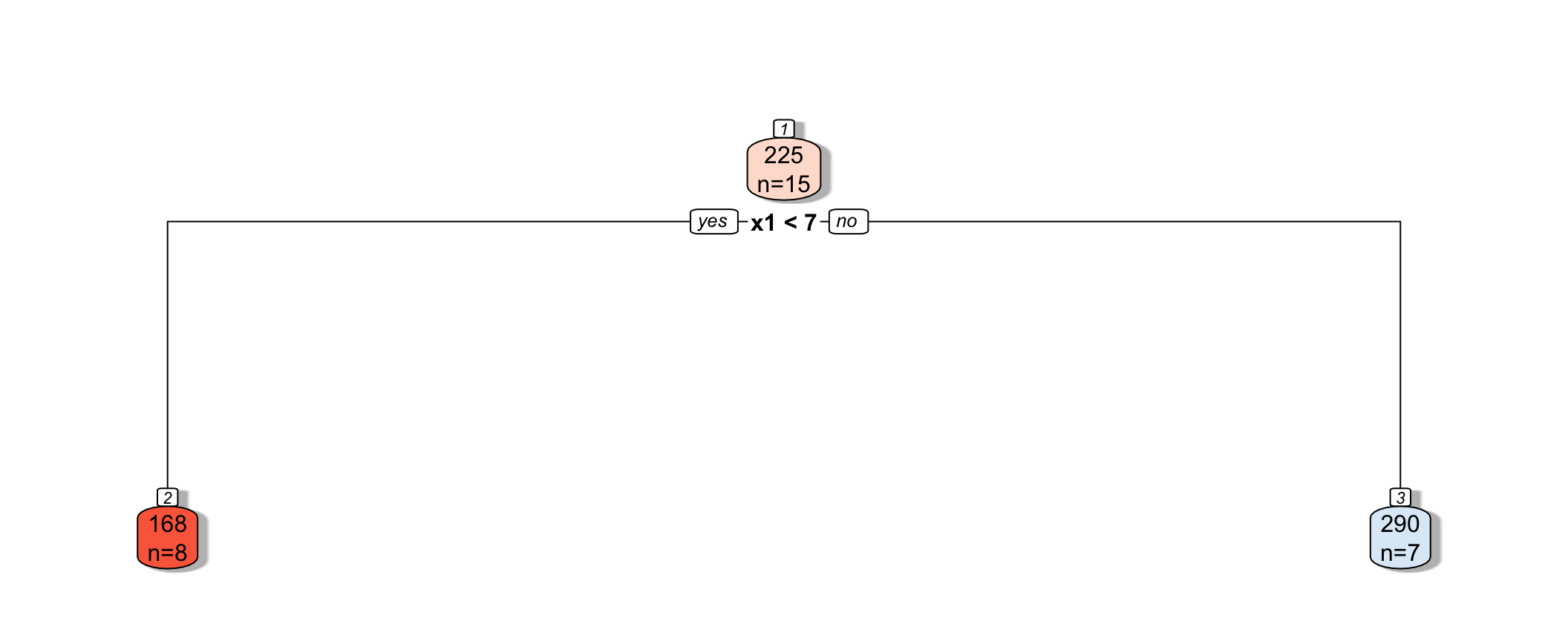 Of the three split’s we’ve calculated, \(\displaystyle\sum_{i=1}^{n_L} (y_i -\bar{y}_L)^2 + \displaystyle\sum_{i=1}^{n_R} (y_i -\bar{y}_R)^2\) is minimized using \(x_1 < 6.5\).