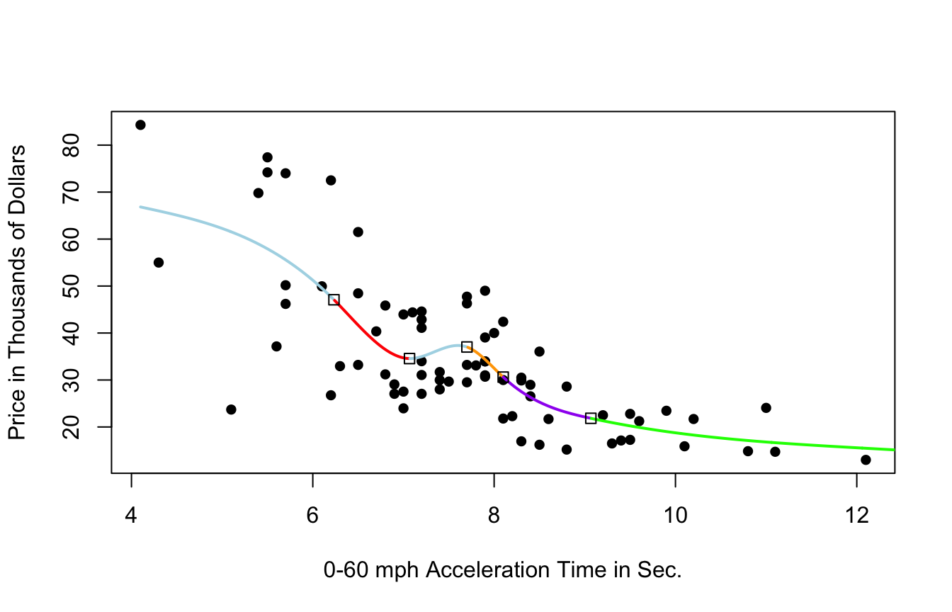Here we’ll keep thing simple by focusing on a spline with a single explanatory variable. Splines can also be used for multivariate data.