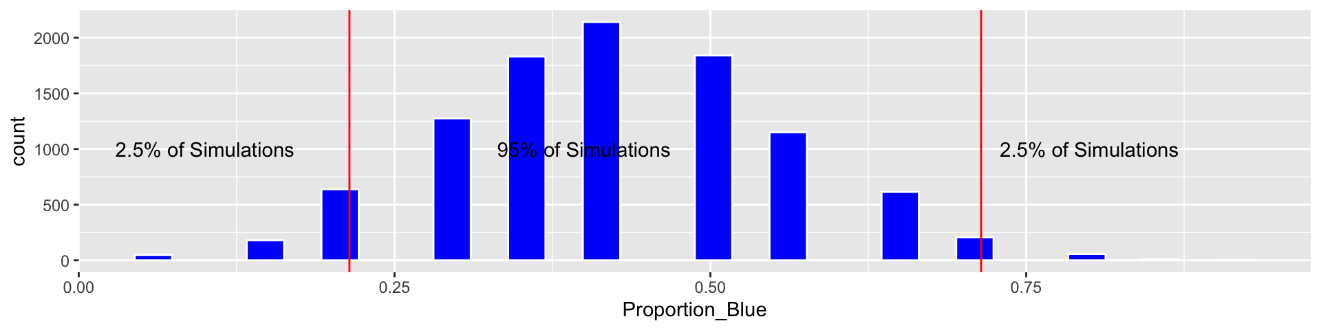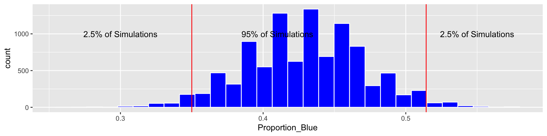 Based on our simulation, we are 95% confident that the proportion of blues among all M&M’s is between 0.35 and 0.5142857.