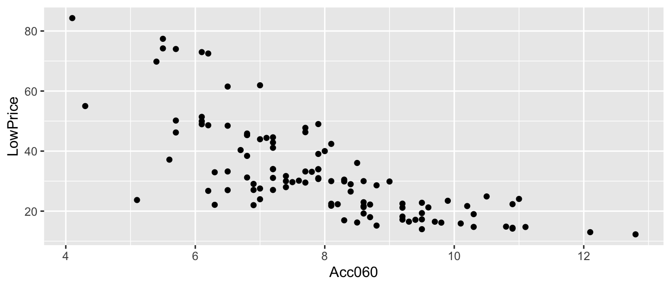 We are 95% confident that the intercept for the regression line relating price to acceleration time is between76.31 and 103.5 thousand dollars. This intercept does not have a meaningful interpretation in context.
