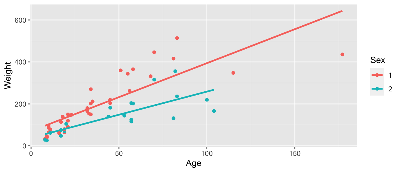 \[ \begin{aligned} \widehat{\text{Weight}} & = b_0+ b_1 \times\text{Age}+ b_2 + b_3\times\text{Age} \\ & (b_0 + b_2) + (b_1+b_3)\times\text{Age} \end{aligned} \]