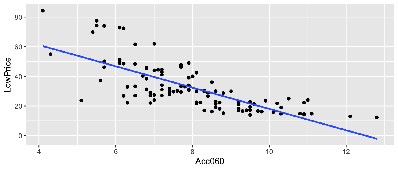 \(\widehat{Price} = 89.90 - 7.193\times\text{Acc. Time}\)