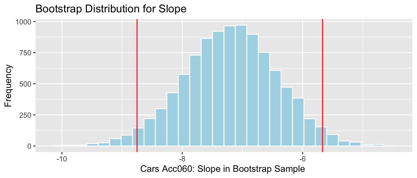 We’ll simulate situations where there is no relationship between location and mercury level, and see how often we observe a value of \(b_1\) as extreme as 0.27195.