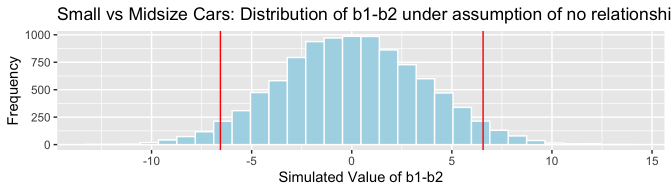Repeat steps 1 and 2 many (say 10,000) times, recording the difference in means (i.e. value of \(b_1\)) each time.
