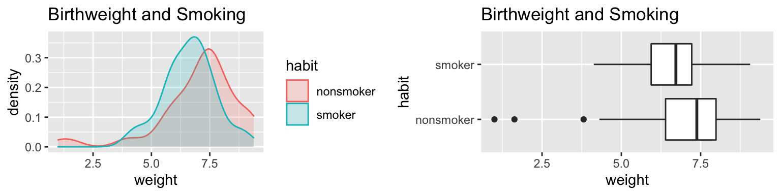 We consider data on the relationship between a pregnant mother’s smoking and the birthweight of the baby. Data come from a sample of 80 babies born in North Carolina in 2004. Thirty of the mothers were smokers, and fifty were nonsmokers.