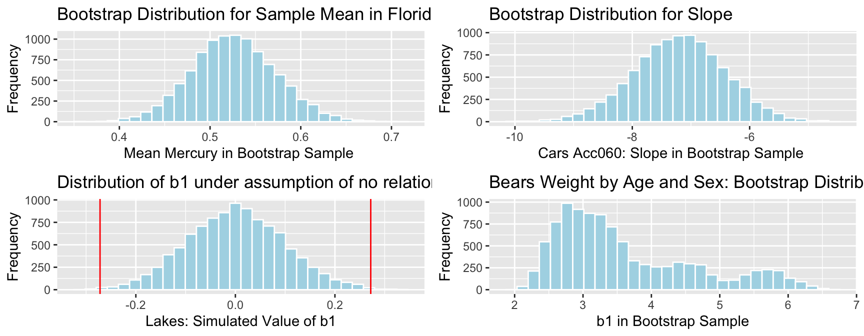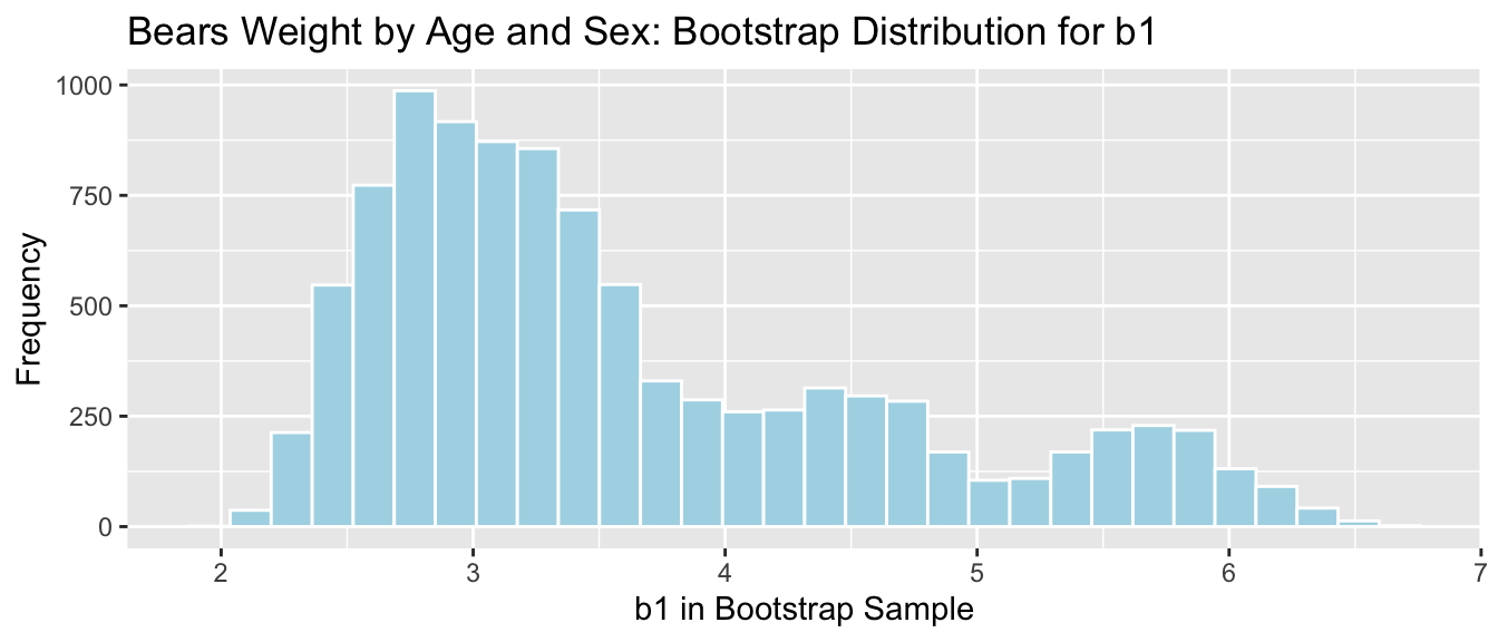 xlab("b1 in Bootstrap Sample") + ylab("Frequency") +