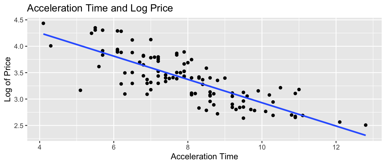 For each additional second in acceleration time, price is expected to multiply by a a factor of \(e^{-0.22} = 0.80\). Thus, each 1-second increase in acceleration time is estimated to be associated with a 20% drop in price, on average.