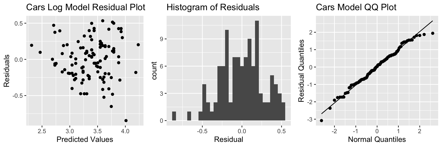 We are 95% confident that the expected price for a car that accelerates from 0 to 60 mph in 7 seconds is between \(e^{3.04} =20.9\) and \(e^{4.14}=63.9\) thousand dollars.