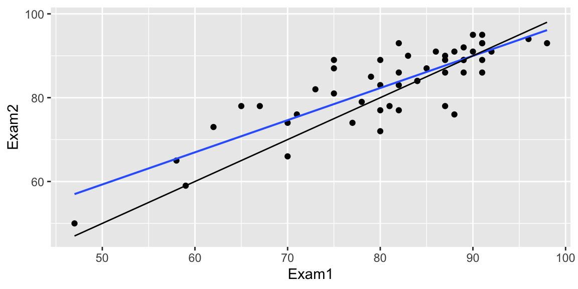 ggplot(data=TestSim, aes(y=Score2, x=Score1))+ geom_point() + stat_smooth(method="lm") +