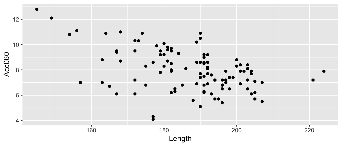 ggplot(data=Cars2015, aes(x=Length, y=Acc060)) + geom_point()