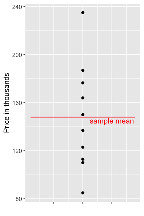 Although the mean price represents our best prediction, we certainly shouldn’t expect the price of the new house to exactly match the mean of the original 10. There is considerable variability between house prices.
