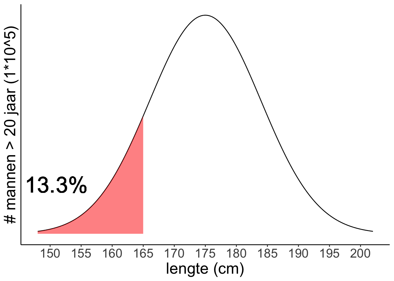 (Merk op dat dat percentage net zo groot is al het percentage mannen langer dan 185 cm. 185 ligt namelijk net zo ver van het gemiddelde (175) als 165. En de normaalverdeling is symmetrisch.)