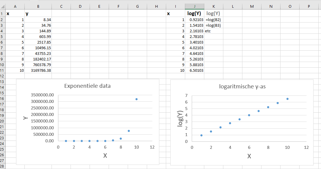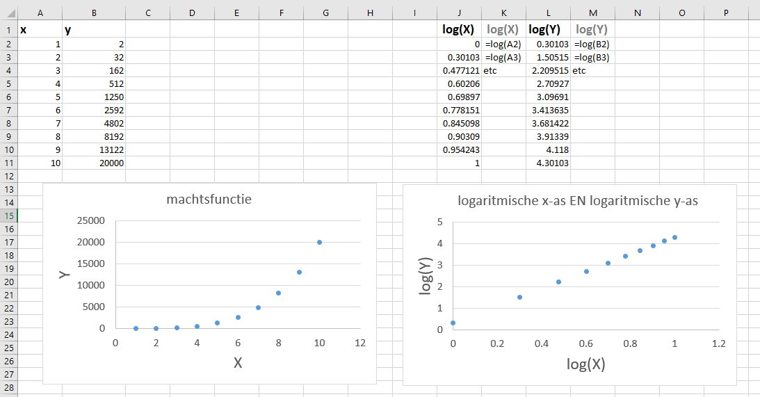 - in Excel niet lineaire verbanden lineariseren m.b.v. logaritmische assen;