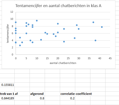 0.2 is nogal laag. Er lijkt niet echt een verband te zijn tussen het aantal chatberichten en het tentamencijfer van studenten.