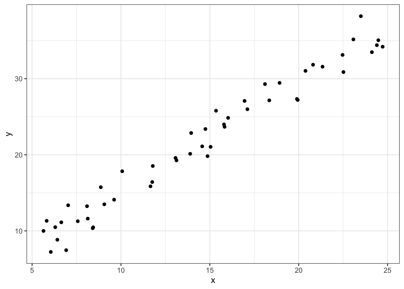 Hoe goed onze voorspelling voor het gewicht van een nieuwe ongewogen hamster gaat zijn, hangt af van hoe goed die lijn op onze punten past (de x- en y-waarden). Dit wordt uitgedrukt in de determinatiecoëfficiënt (\(R^2\)). En we hebben geluk: in het geval van een lineair verband tussen twee variabelen (dus een rechte lijn), is dat gewoon het kwadraat van de correlatiecoëfficiënt (dus hier geldt: \(R^2 = r^2\)).