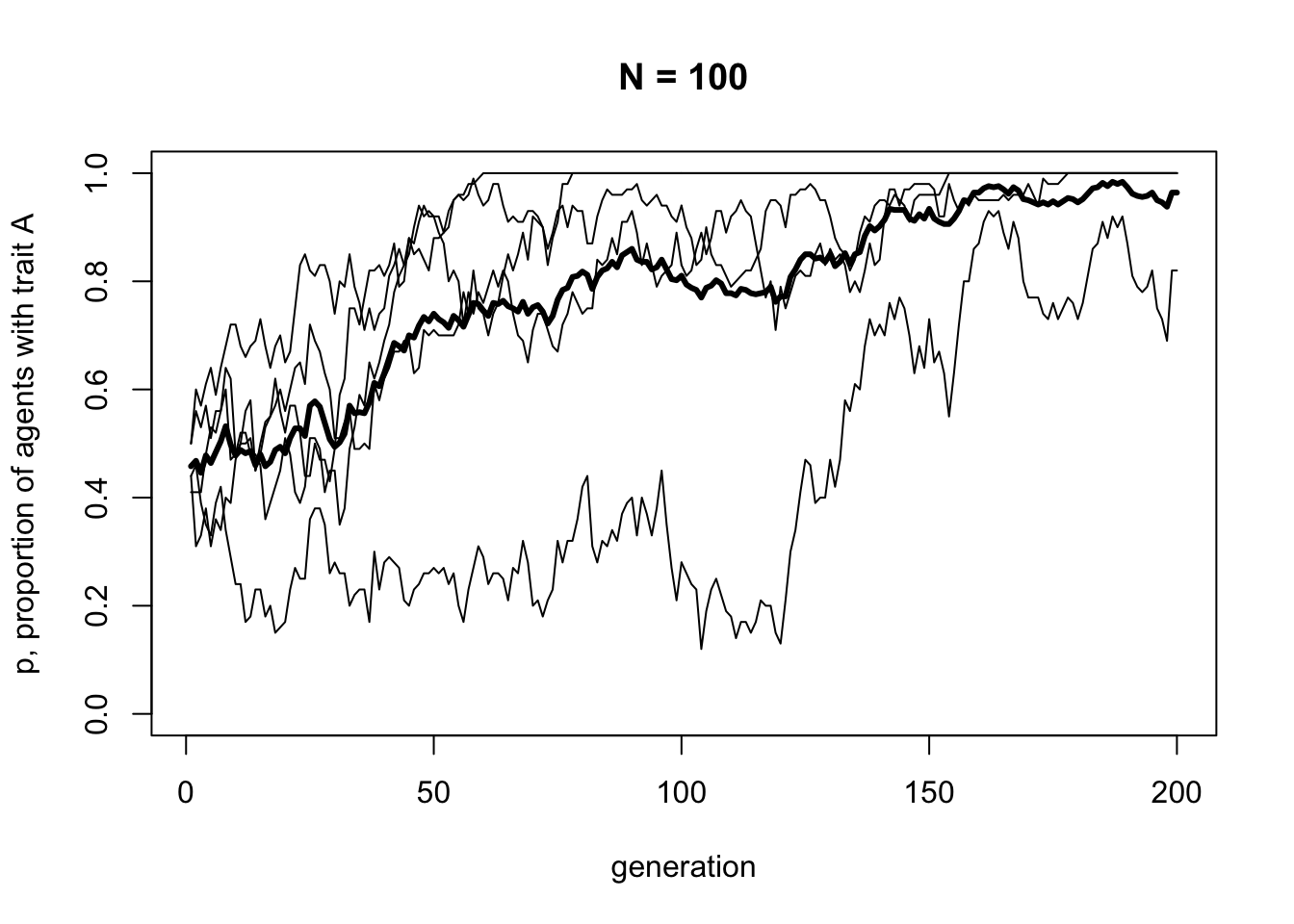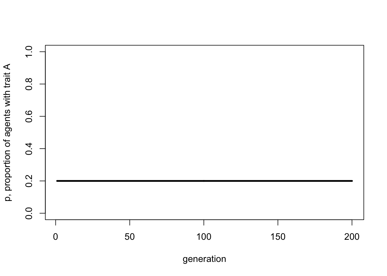 Unbiased transmission, or random copying, is by definition random, so different runs of this simulation will generate different plots. If you rerun all the code you’ll get something different again. It probably starts off hovering around 0.5, the approximate starting value of \(p\), and might go to 0 or 1 at some point. At \(p = 0\) there are no \(A\)s and every agent possesses \(B\). At \(p = 1\) there are no \(B\)s and every agent possesses \(A\). This is a typical feature of cultural drift, analogous to genetic drift: in small populations, with no selection or other directional processes operating, traits can be lost purely by chance.