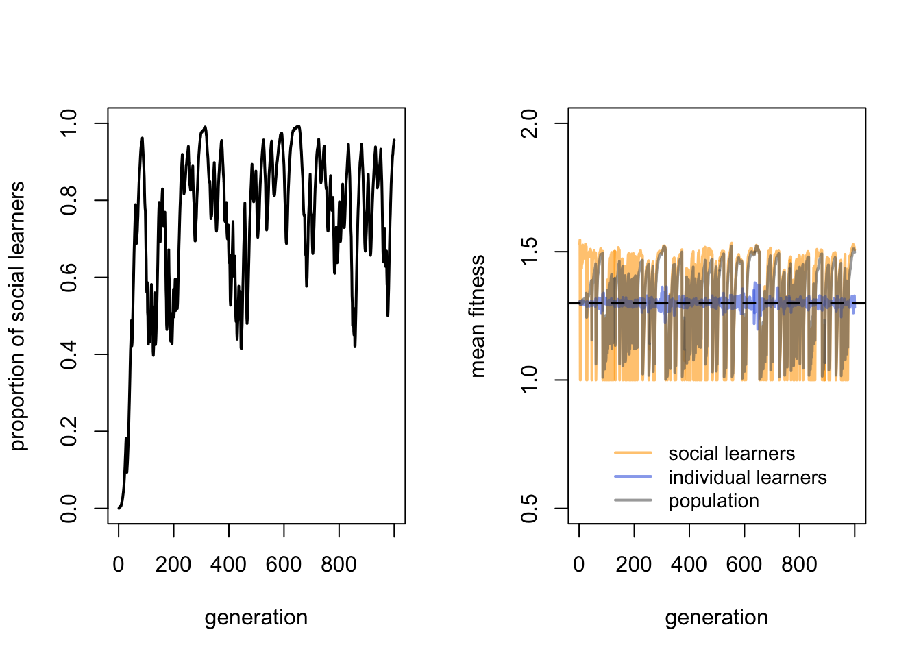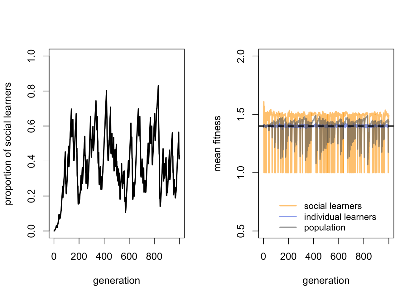 As predicted, the proportion of social learners has dropped to around 0.5. Because environmental change is back, Rogers’ paradox is also restored.