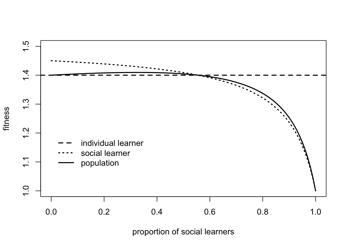 Rogers’ model resembles producer-scrounger models from ecology (Barnard & Sibly 1992). In a feeding context, ‘producer’ birds discover new sources of food, while ‘scrounger’ birds follow the producers and exploit the food sources they find. In Rogers’ model, individual learners are ‘information producers’ discovering new cultural traits, while social learners are ‘information scroungers’ copying the producers’ cultural traits without paying the cost.