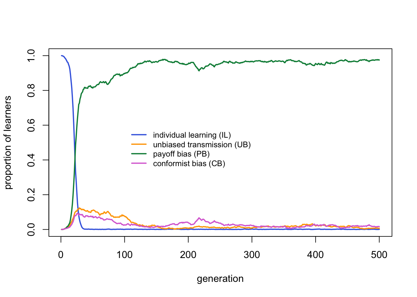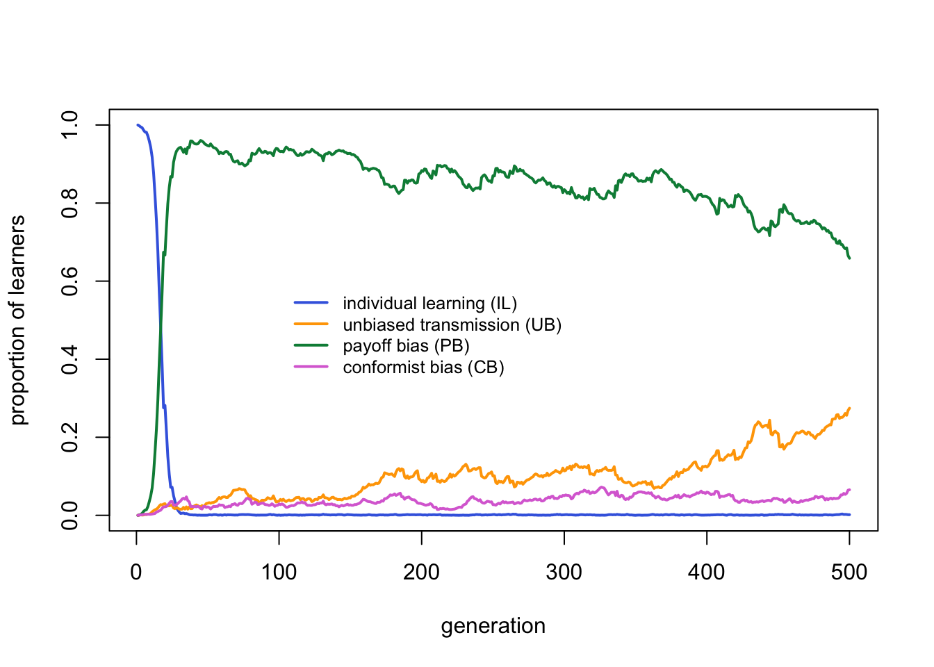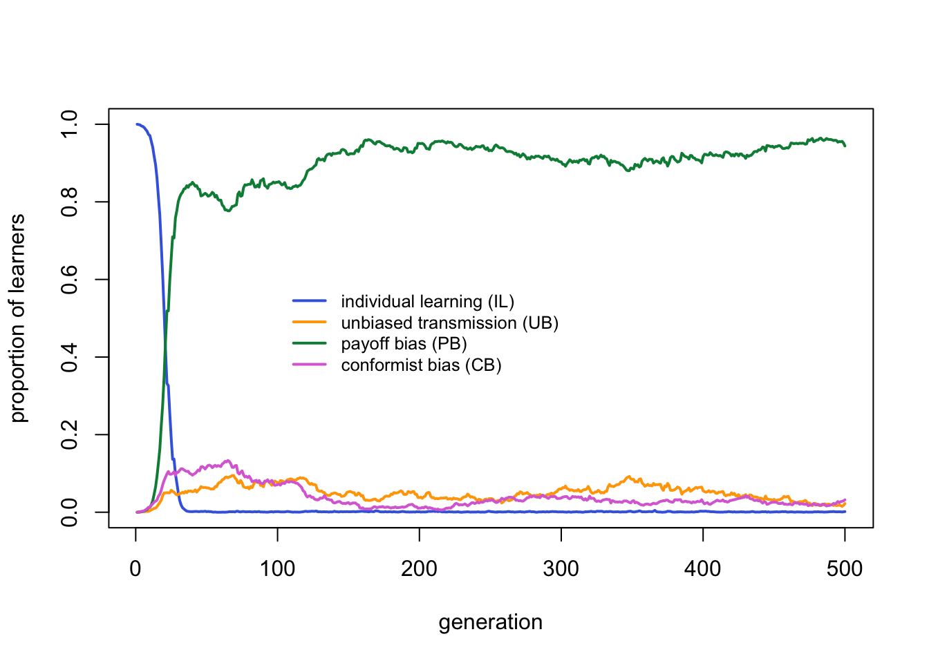 The success of CB in spatially varying environments hinges on whether it is less costly than PB. Is this a plausible assumption? Nakahashi et al. (2012) think so, arguing that “[t]his assumption seems plausible, given that [PB] have a more complicated task than [CB], which involves assessing payoffs or at least relative payoff differences for the cultural traits present.” (p.405). While that may be the case, tallying the frequencies of multiple traits across multiple demonstrators also seems quite costly. Empirically quantifying the costs of social learning strategies such as CB and PB would be a worthwhile endeavour.