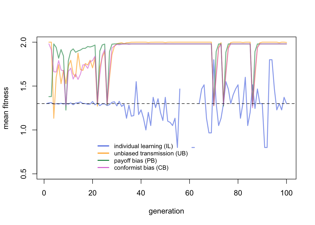 Nakahashi, W., Wakano, J. Y., & Henrich, J. (2012). Adaptive social learning strategies in temporally and spatially varying environments: How temporal vs. spatial variation, number of cultural traits, and costs of learning influence the evolution of conformist-biased transmission, payoff-biased transmission, and individual learning. Human Nature, 23, 386-418.