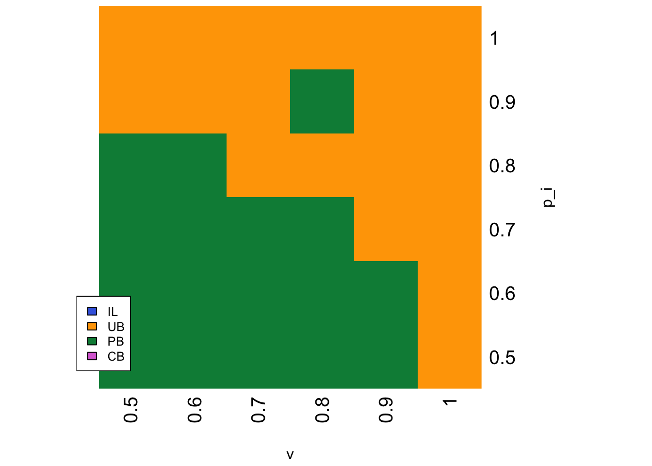 In spatially varying environments, PB is also widely favoured unless environments are stable (i.e. there is no migration) or individual learning is very accurate, in which case UB again is favoured. However, CB is much more widely favoured in spatially varying environments than temporally varying environments. CB is favoured when its costs are only slightly less than those of PB, and when the strength of conformity (\(f\)) and number of demonstrators (\(n\)) are reasonably large. Under these conditions migrating CB agents can take advantage of the majority correct behaviour that is found in each group. This again recreates the analytical findings of Nakahashi et al. (2012) who state that “If the cost to [PB] is larger than that to [CB], [PB] never evolve” (p.406).
