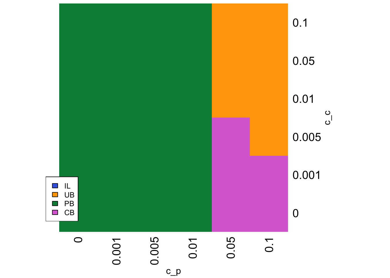 Now CB is favoured over PB. Whereas in temporally varying environments CB was only favoured when the costs to PB were so high as to remove PB from the competition, here CB is favoured when its costs are only slightly lower than PB. We can confirm this by running the temporal model with the same parameter values: