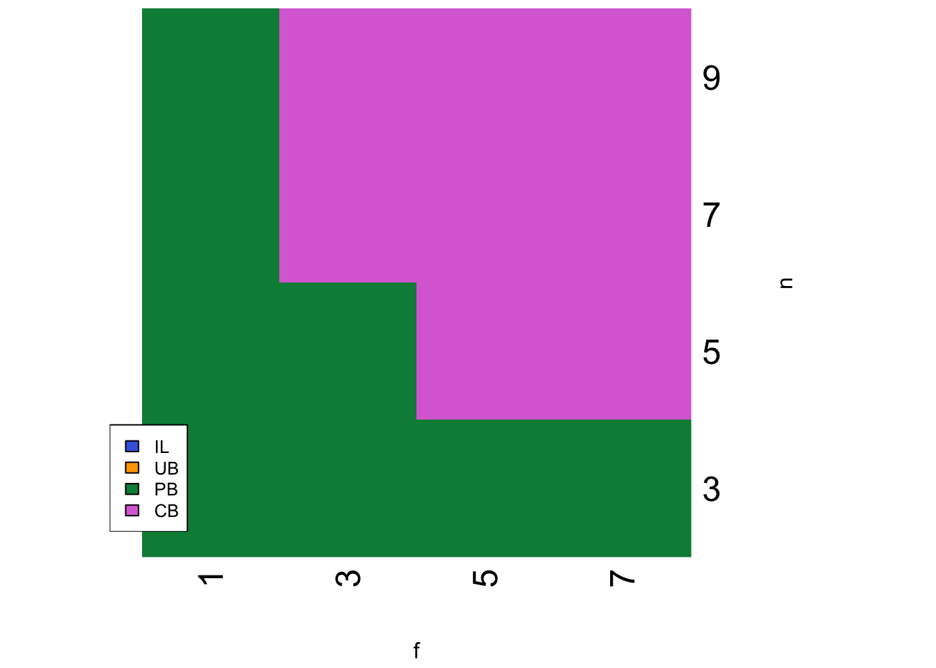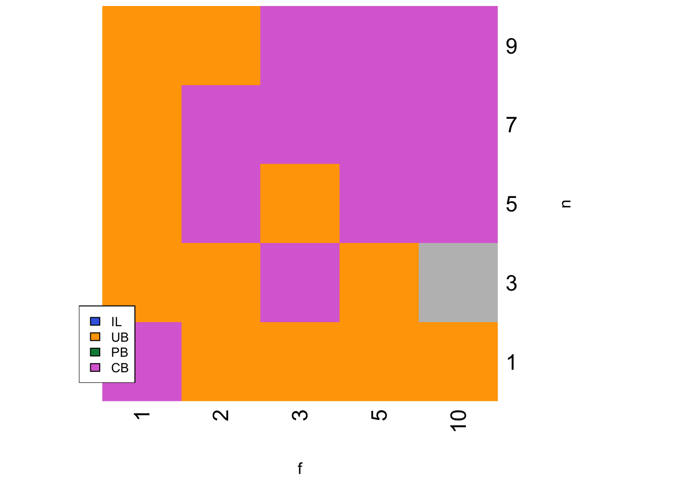 Above we determined that CB agents do well when \(f\) and \(n\) are both large, and the cost of CB is slightly lower than those of PB. Here we can test this more thoroughly: