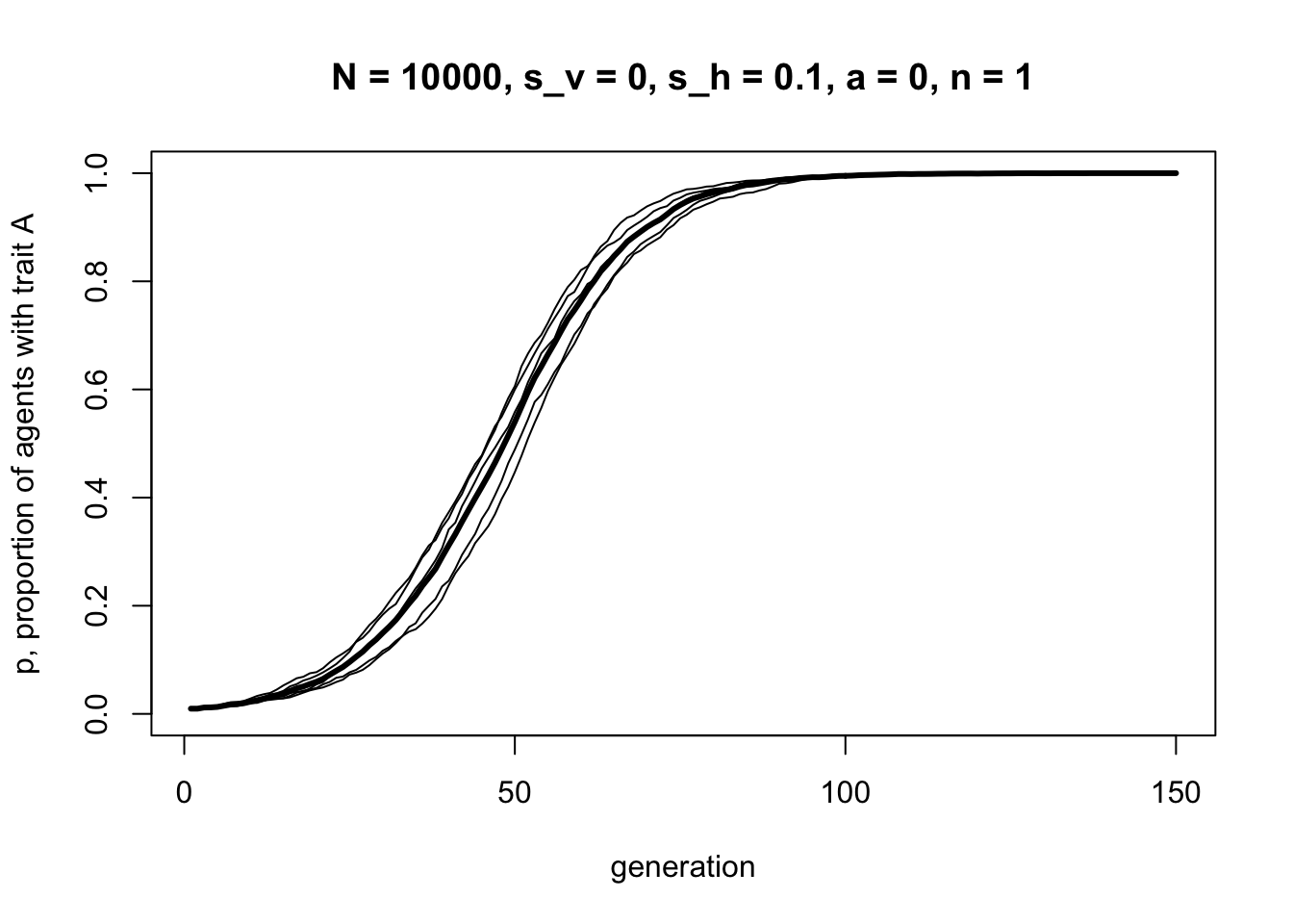This looks a lot like the s-shaped curve we found in Model 3 for \(s = 0.1\). We have recapitulated unbiased transmission from Model 2 combined with biased transmission from Model 3, but assuming vertical cultural transmission from two parents, rather than randomly picking one demonstrator from the previous generation.