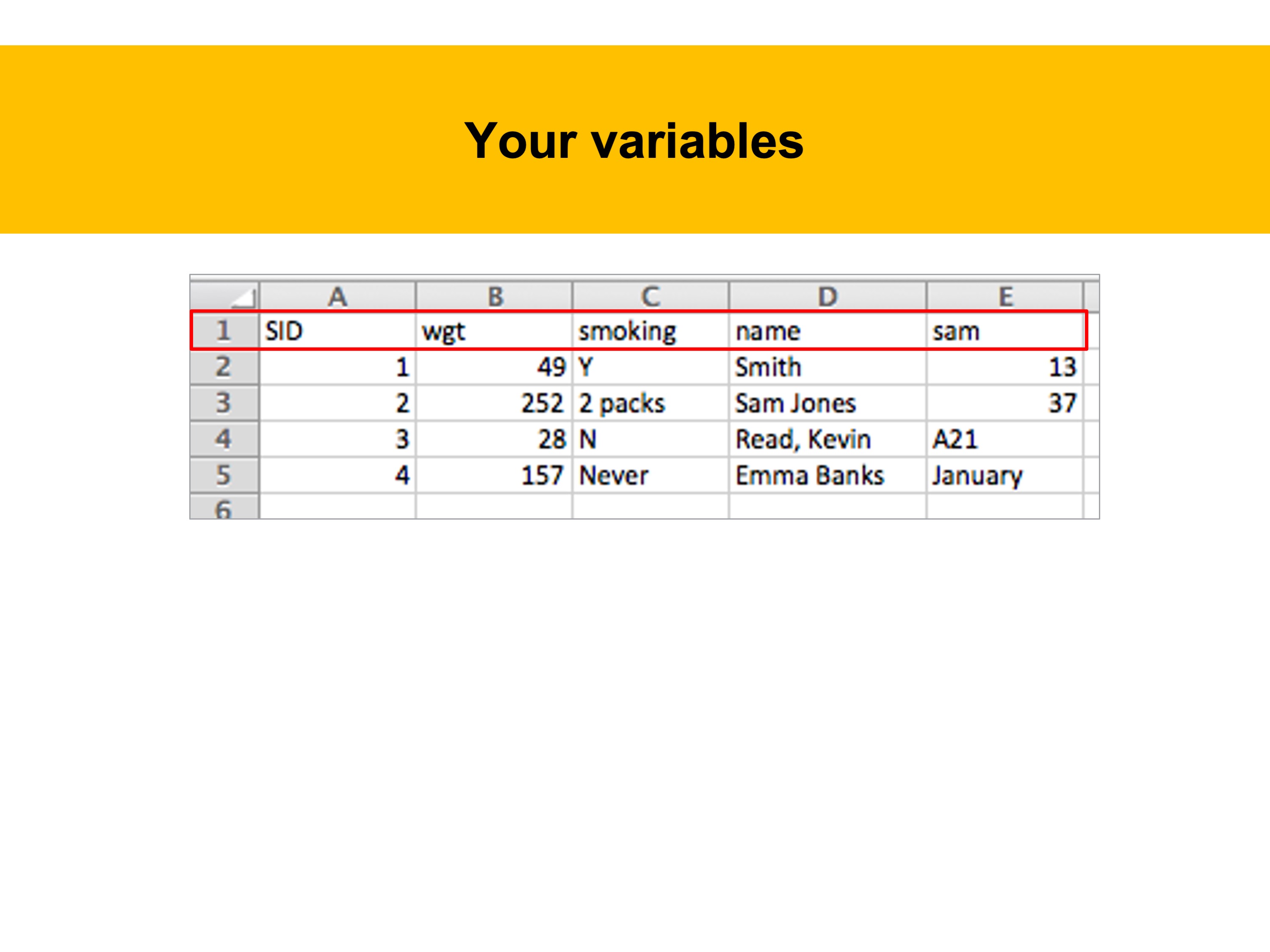 In this example, variable names are cryptic. One can guess that SID is subject ID or that wgt is weight, but a variable name like sam is anybody’s guess. While the “smoking” is clear, the meaning is not – ever smoked? how much smoked?