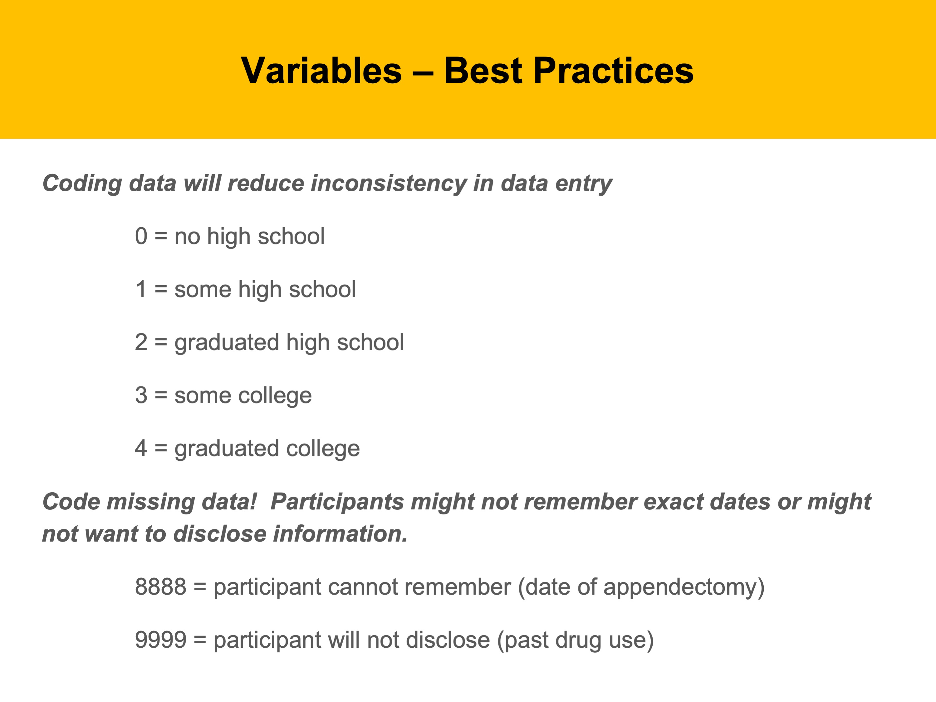 Variable labels (which should be intuitive and meaningful)) – a name that seems obvious now might be incomprehensible in a few months to yourself, let alone to someone new trying to interpret your data.