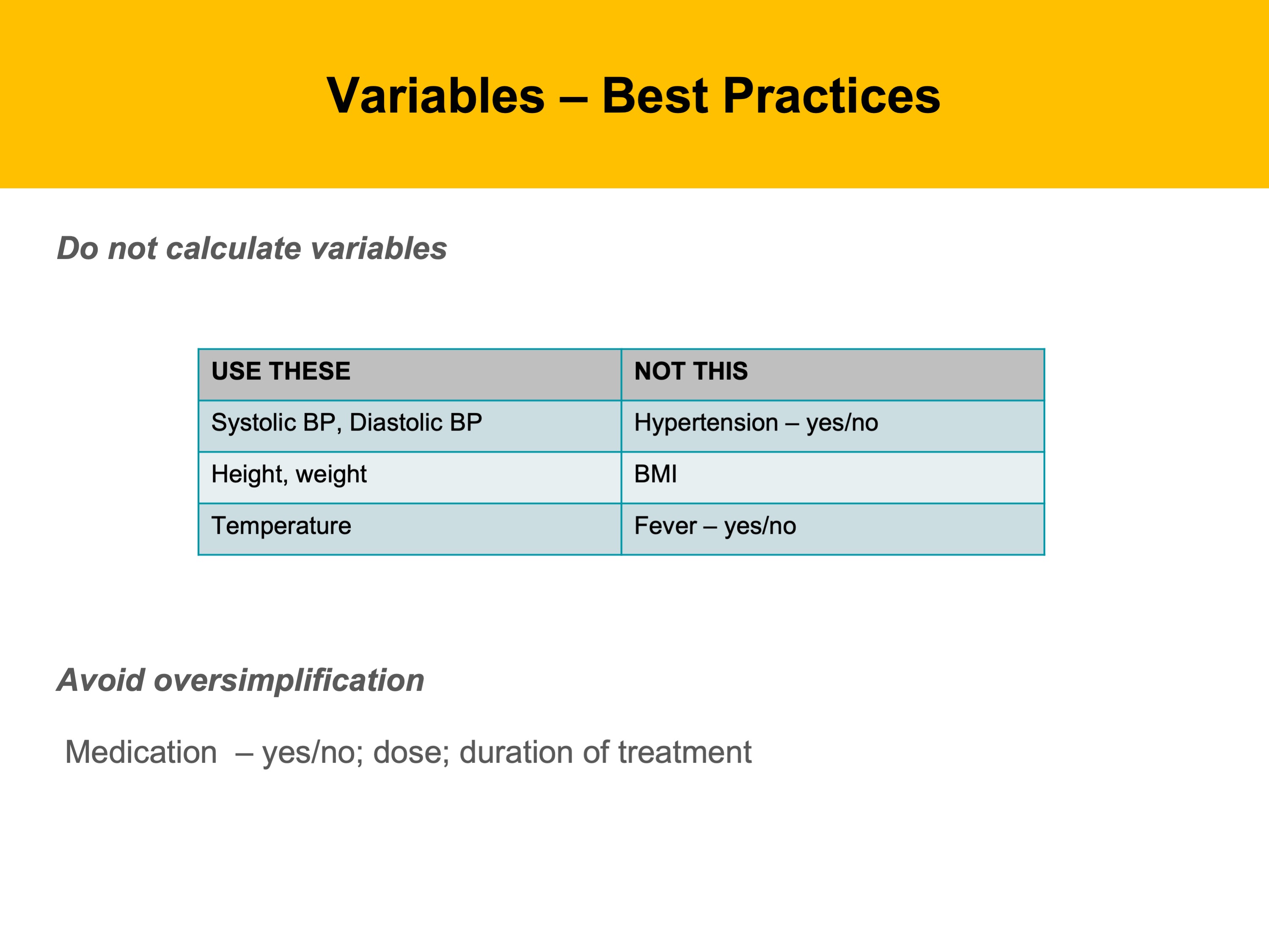 In addition, do not collapse data until you need to; leave your variables in the raw. For example, rather than recording BMI, record height and weight. You can always calculate BMI later, but you can not go backwards to height and weight if you only have BMI.