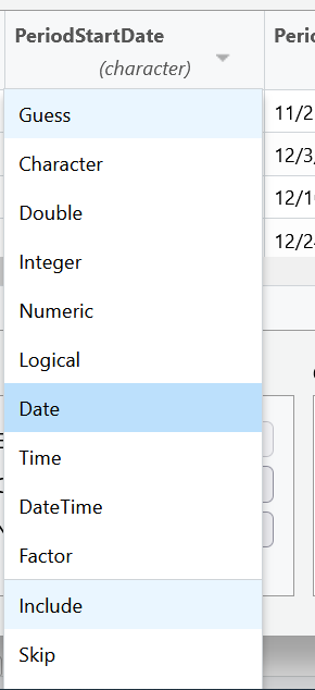For example, let’s look at the columns PeriodStartDate and PeriodEndDate. These columns contain dates, but RStudio wants to read them as character data. This is very common when importing data. Let’s change these columns to the date data type, by using the drop down menu to select date data.