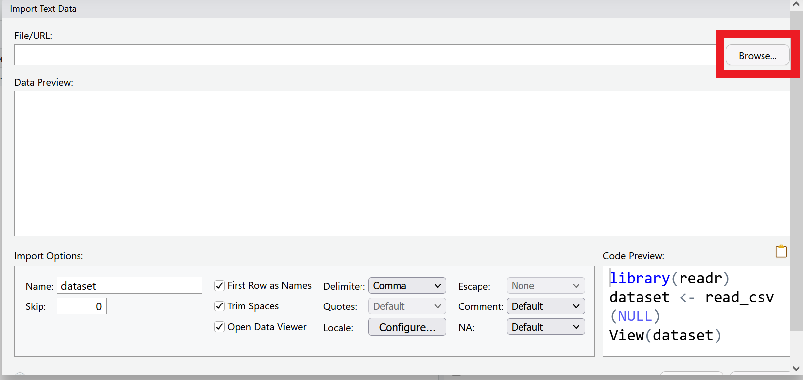 Select Browse in the dialog box that opens, and navigate to your data folder and choose the file called measles_us.csv