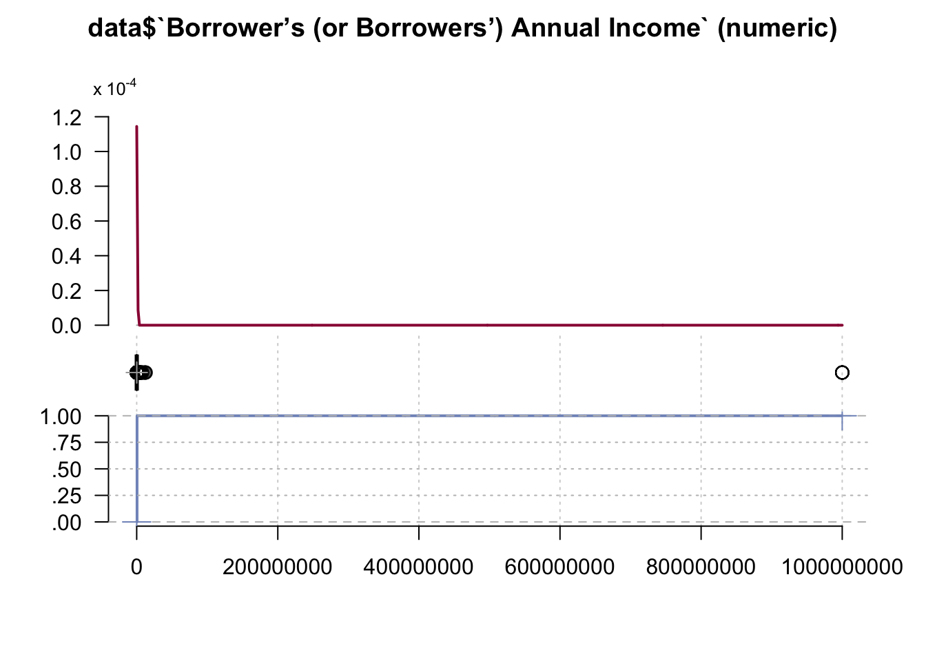 data <- subset(data, `Borrower’s (or Borrowers’) Annual Income`!=999999998)Now let’s look at the graph again