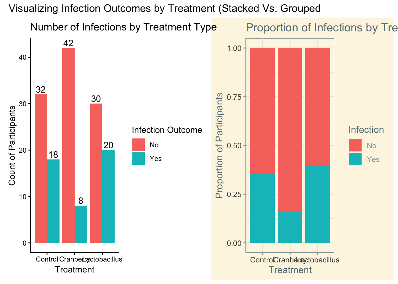 grouped + stacked + plot_annotation(title = "Visualizing Infection Outcomes by Treatment (Stacked Vs. Grouped")