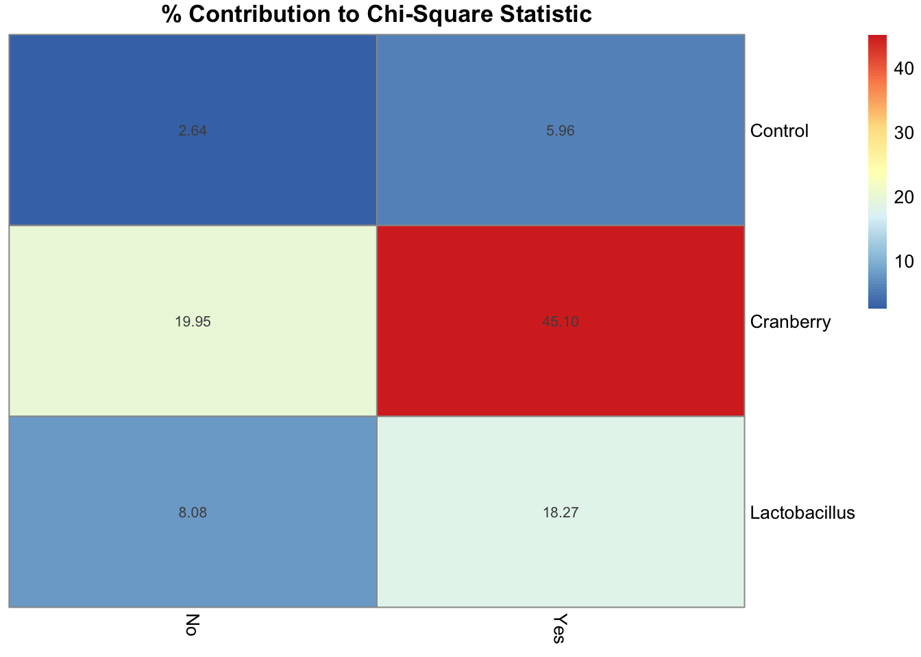 Through this, we discovered that about 65% of the X^2 value is due to the cranberry treatment.