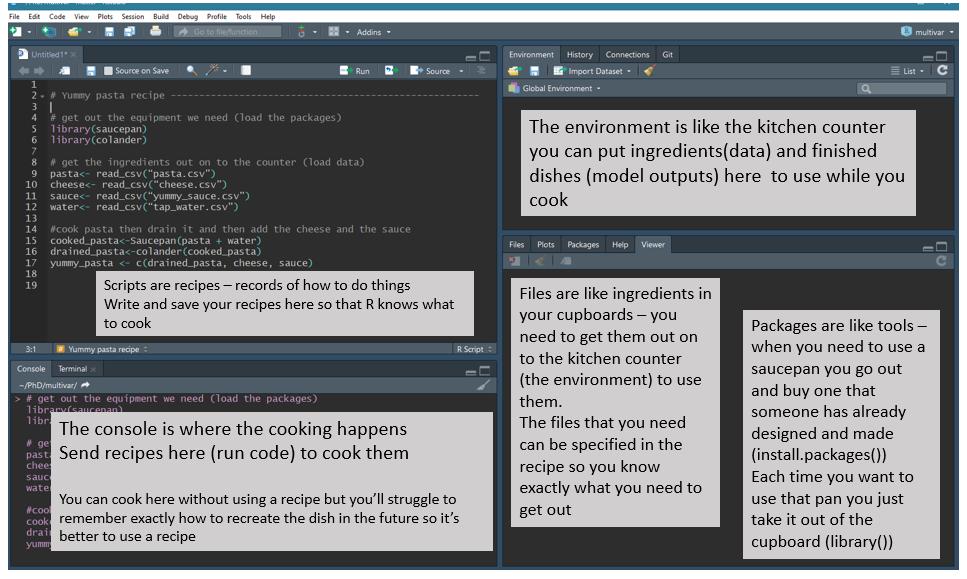 On the left-hand area of RStudio, you have your Current File (Editor) and Console. The “heart of R” is the Console window. This is where instructions are sent to R, and its responses are given. It’s the place to try things out, but don’t want to save. Finally, the Editor is where you write more complicated scripts without having to run each command. When you run such a script file, it gets interpreted by R in a line by line fashion. This means that your data cleaning, processing, visualization, and analysis needs to be written up in sequence otherwise R won’t be able to make sense of your script. There is an important practical distinction between the Console and the Editor: In the Console, the Enter key runs the command. In the Editor, it just adds a new line.