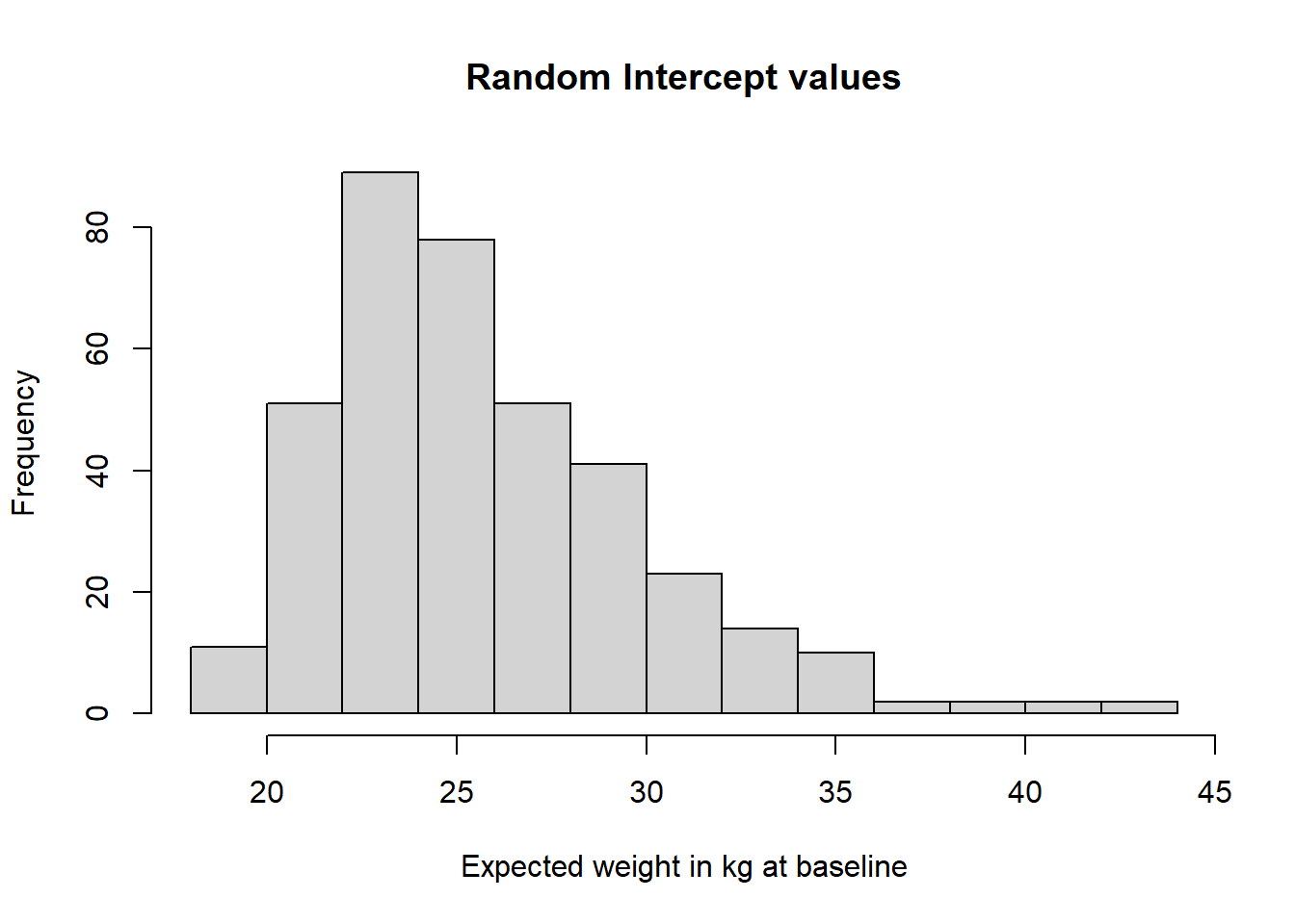 First we note that each trajectory (individual child) can be characterized by its own baseline and rate of increase. For instance, some boys start at below average weight and stay low. Some start average but gain weight quickly. Some start high and gain weight at an average rate. And all combinations of the baseline and growth rate are of course possible.