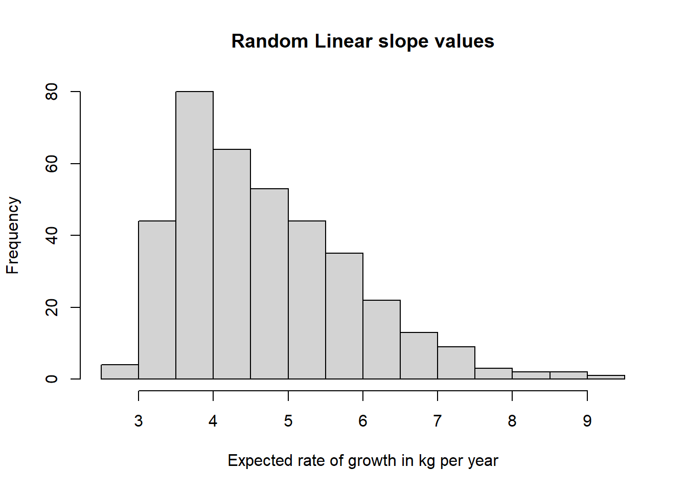 You can see that there are 3 values for each boy - i, s and q. While i and s vary between individuals, q is constant because we set it up as a fixed effect. You can plot histograms of the intercept and linear slope values as follows: