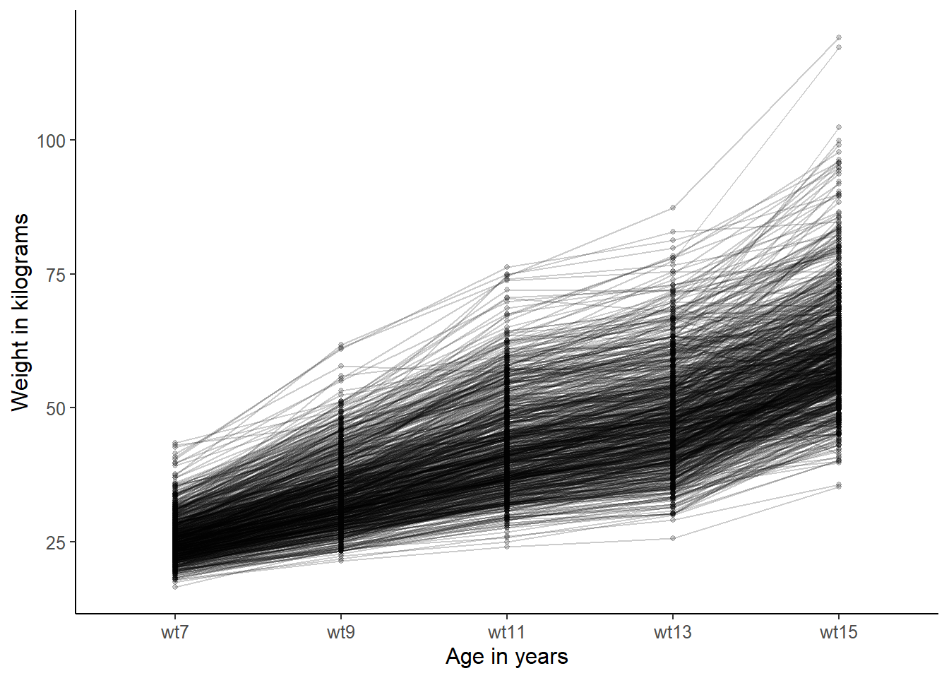 Each line on the graph represents a child, and you can see how weight of each child changes over time. You can see that there is strong tendency to weight increase, as you may expect, but also quite a lot of variation in the starting weight and also in the rate of change. You can perhaps see an overall tendency for almost linear growth between ages 7 and 11, but then slowing as children reach 13,and then a fast acceleration between 13 and 15 (puberty).