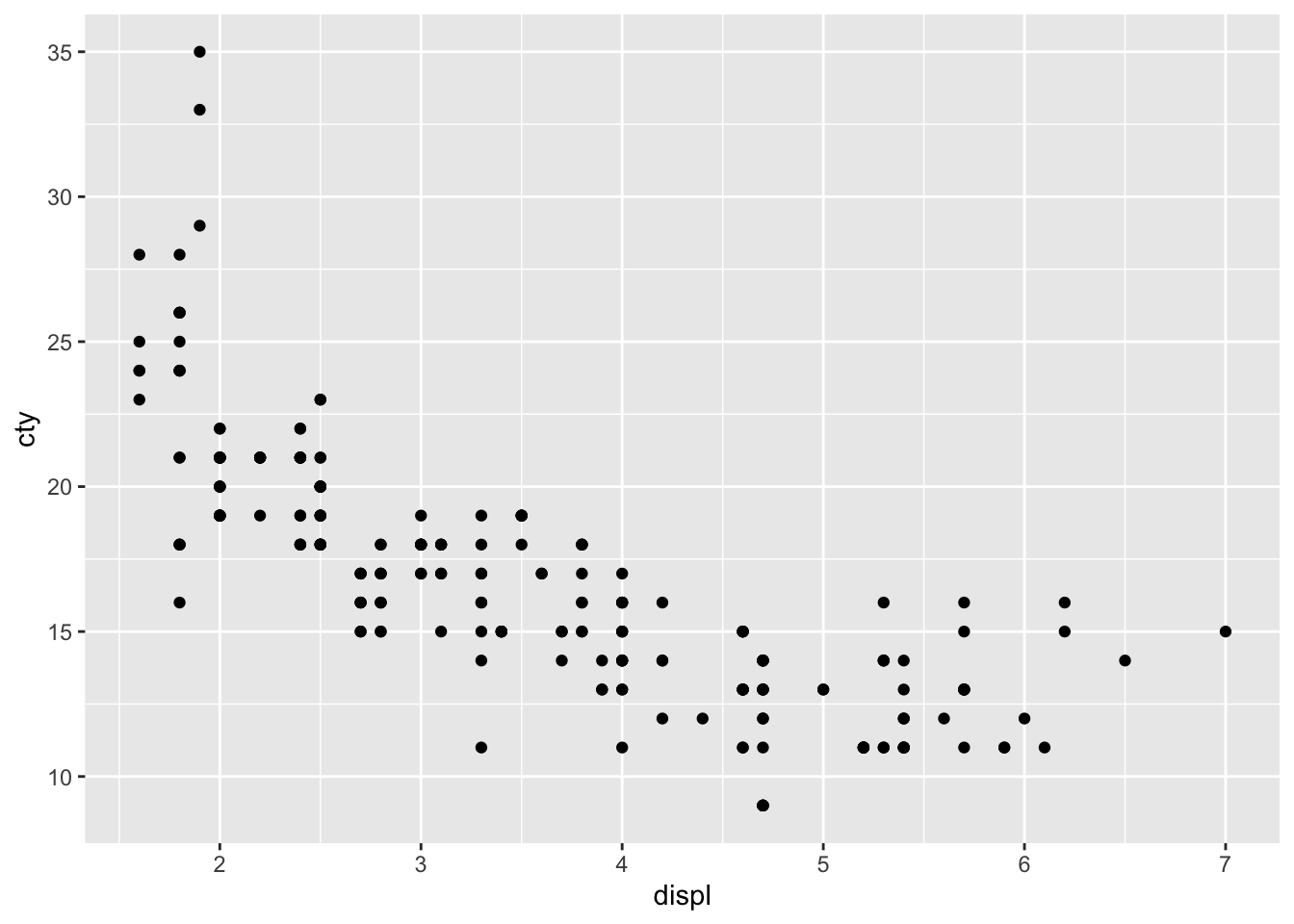 Because we want a scatter plot, each point will have an x and a y coordinate. We want the x axis to represent engine volume ( x = displ ), and the y axis to represent the city mileage ( y = cty ).