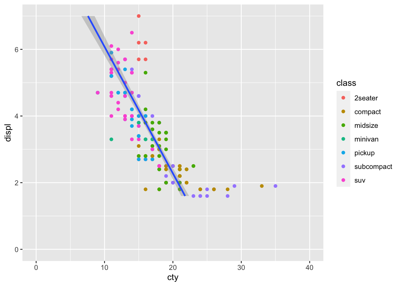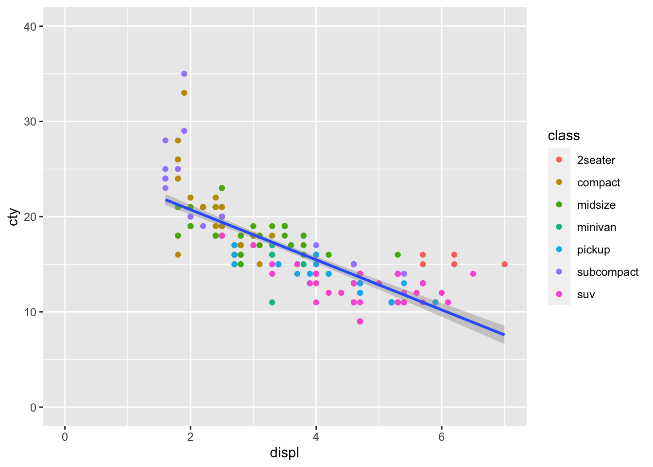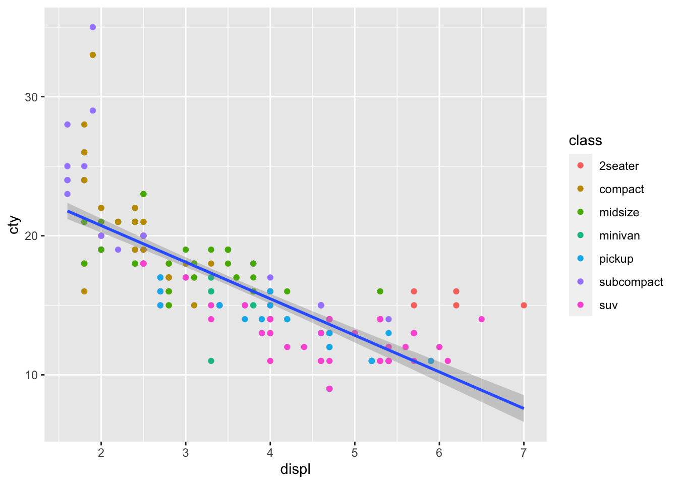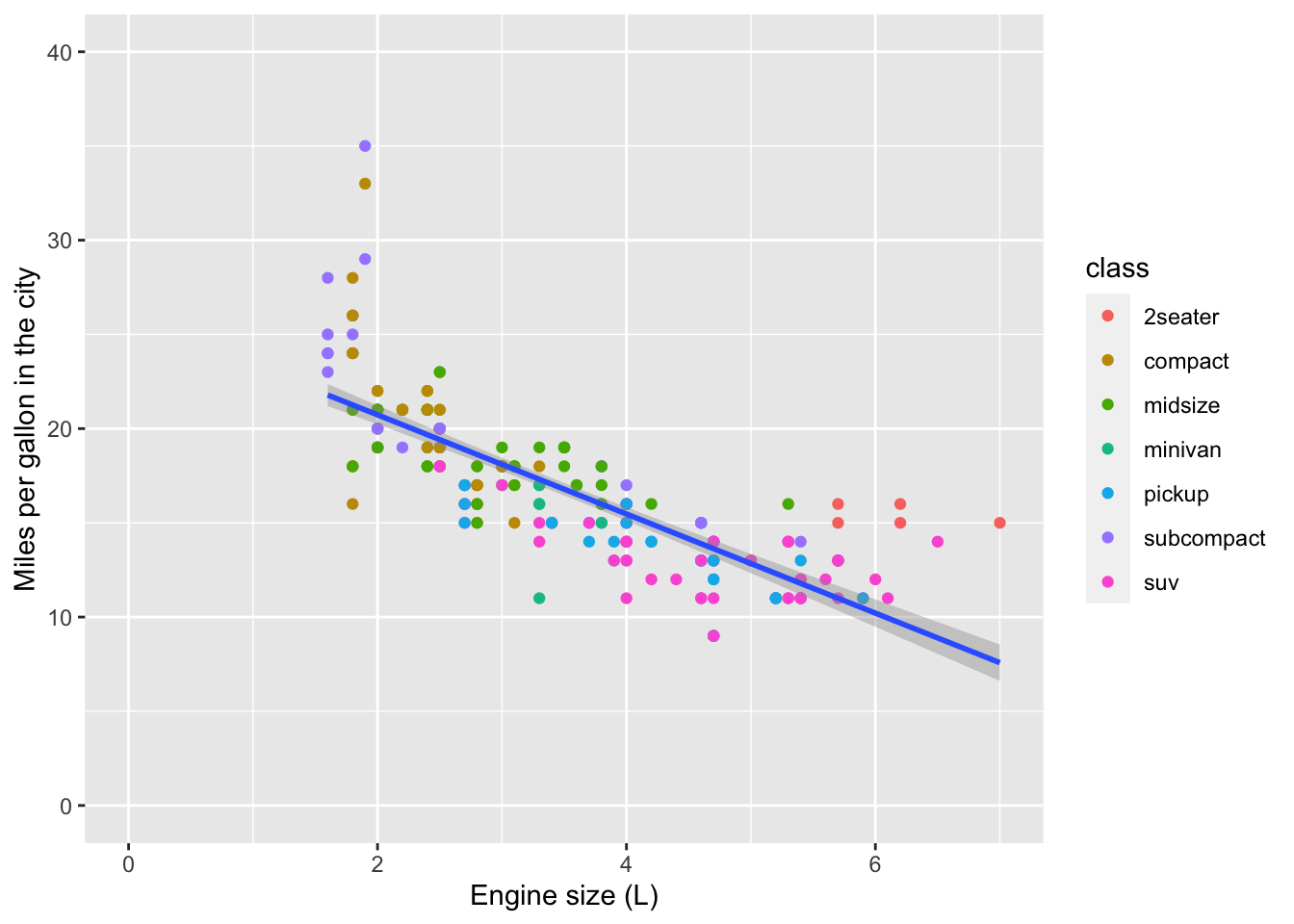 We can see the relationship between engine size and mileage. But what if we want to model this relationship with a trend line? We can add another ‘layer’ to this plot, using a different geometric representation of the data. In this case a trend line, which is in fact a summary of the data rather than a representation of each point.