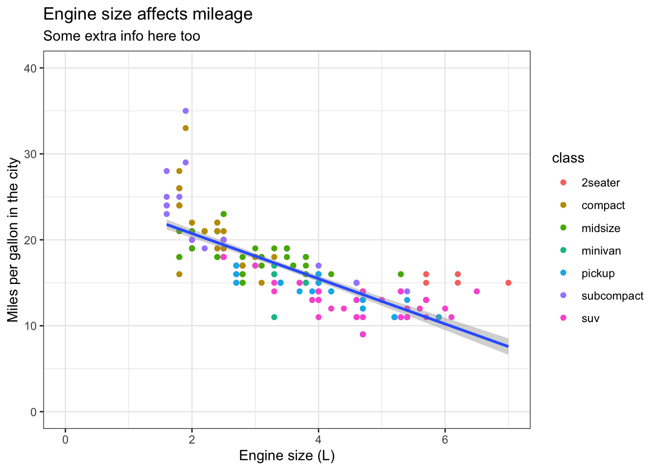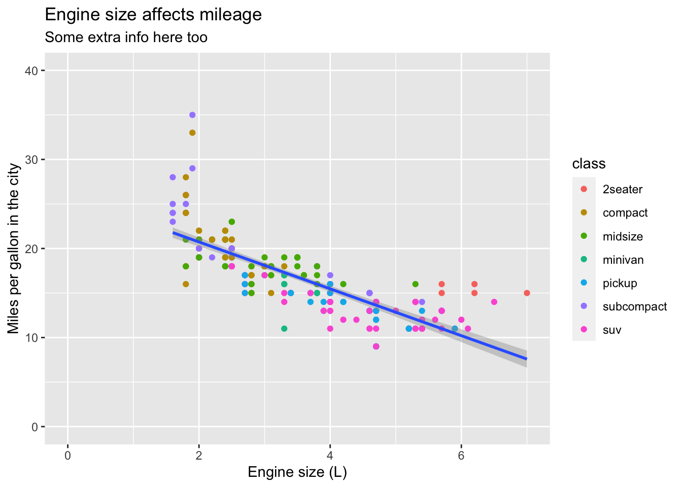 ggtitle(label = 'Engine size affects mileage', subtitle = 'Some extra info here too')## `geom_smooth()` using formula 'y ~ x'