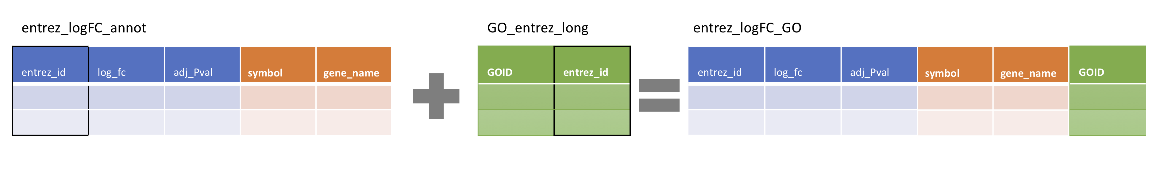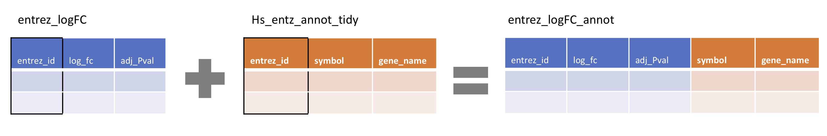 Our first task is to join the the entrez_logFC results table with the gene annotations in Hs_entz_annot_tidy. We will use the joint key ‘entrez_id’ (outlined in black).
