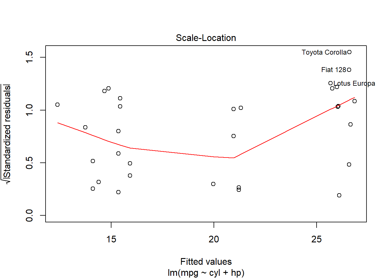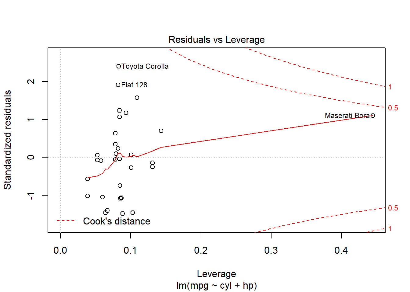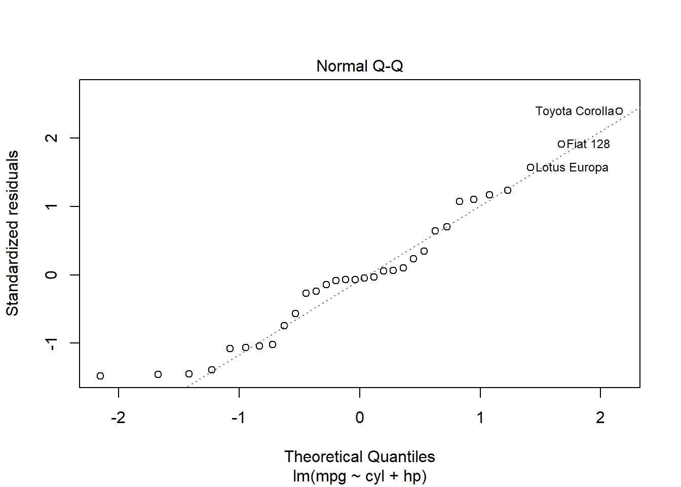 You’ll see that one of the plots above is a Normal Q-Q plot with a dotted line. For now we will only focus on this one. The residuals appear to be somewhat normal, since they are close to the line, but perhaps not as normal as we would like them to be.