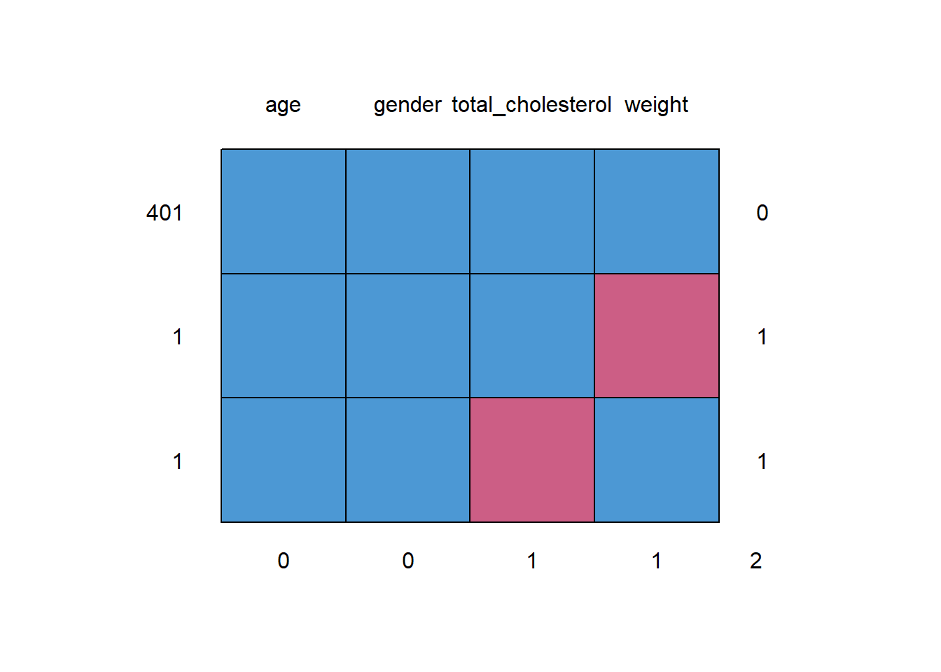 This is quoted from the following source, except the variable names have been changed to make reading easier: Section 4.1 “Missing data pattern” in van Buuren, Stef. Flexible Imputation of Missing Data. https://stefvanbuuren.name/fimd/missing-data-pattern.html.↩︎