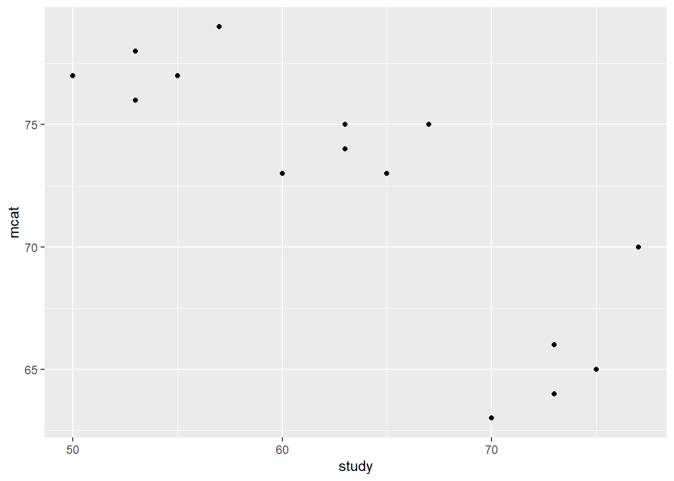 Above, we loaded the dplyr and ggplot2 packages. We then created an empty plot called p in which the y-axis is mcat and the x-axis is study. We then added points to this empty plot to make the scatterplot that we wanted to see. It is not required for you to understand all of the code above. To use this code to make your own scatterplot, replace study with your independent variable and replace mcat with your dependent variable.